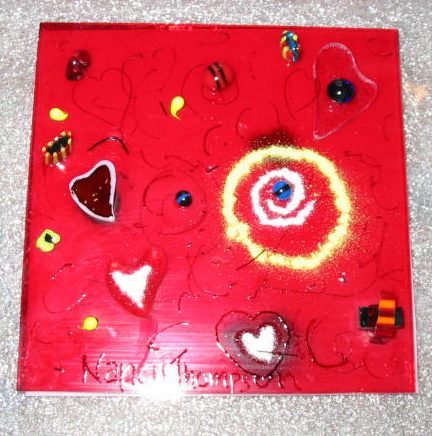 | This Page contains photos of Patty Gray's students' projects from a class at Kirkland Arts Center in Kirkland, Washington on February 1st, 2003. This was a one day fused glass workshop for children. |